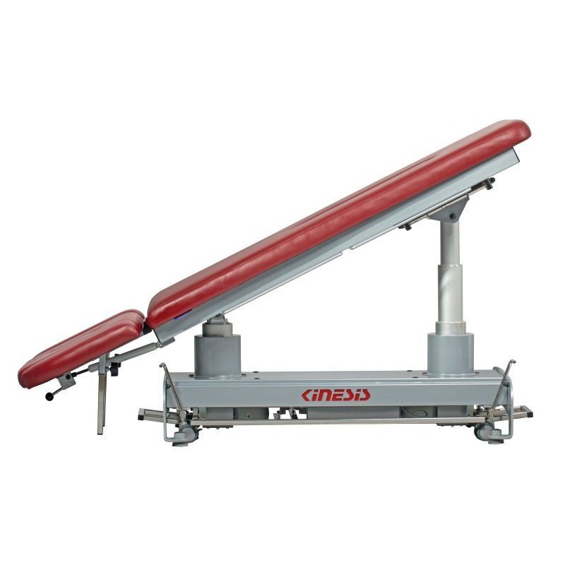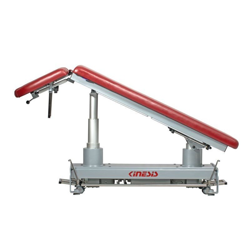 Stół rehabilitacyjny PERFECT II. Składa się z 2 części. Wysokość leżyska możemy regulować elektrycznie, dzięki ramie wokół stołu. Ustawiać możemy też przechył wzdłużny Trendelenburga i anty-Trendelenburga na kolumnach, za pomocą ręcznego pilota.  Konstrukcja stworzona z malowanej proszkowo stali. Posiada uchwyty do zamocowania pasów stabilizacyjnych oraz kółka transportowe.