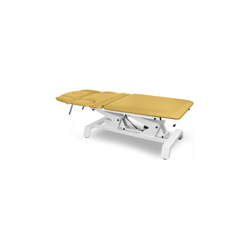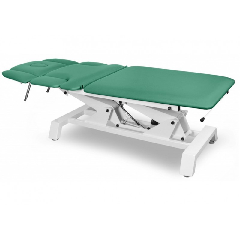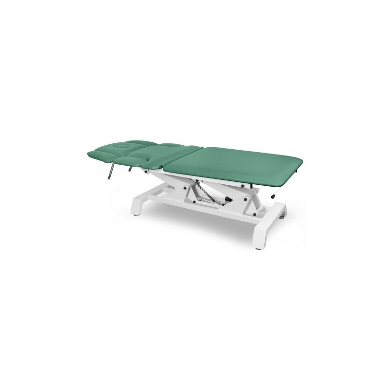 KSR 3 L E to trzyczęściowy, stacjonarny stół rehabilitacyjny, który posiada leże umożliwiające uzyskanie pozycji Pivota oraz fotela. Ustawienie stołu do pozycji Pivota oraz regulacja wysokości stołu odbywa się za pomocą siłownika elektrycznego. Nowe modele stacjonarnych stołów do rehabilitacji, charakteryzujące się smukłym i nowoczesnym designem. Kolor stelaża biały, natomiast kolor tapicerki skóropodobnej do wyboru.