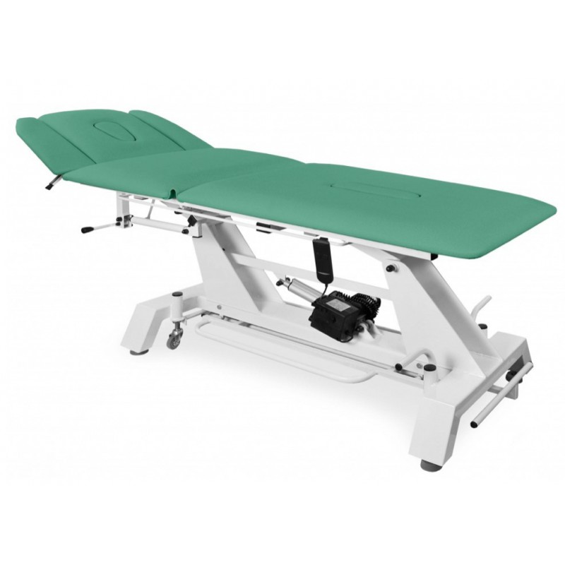 KSR F to trzyczęściowy, stacjonarny stół rehabilitacyjny z elektryczną regulacją wysokości, który posiada leże umożliwiające uzyskanie pozycji fotela. Nowe modele stacjonarnych stołów do rehabilitacji charakteryzują się smukłym i nowoczesnym designem. Kolor stelaża biały, natomiast kolor tapicerki skóropodobnej do wyboru.