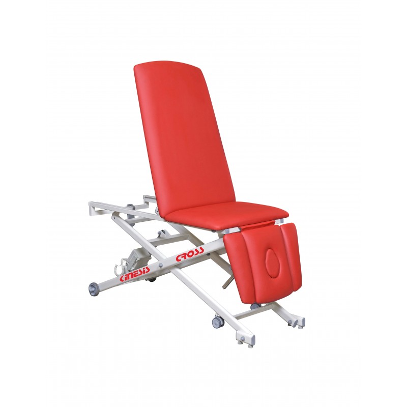 Stół rehabilitacyjny CROSS 3 F rekomendowany jest do użytku w gabinetach fizjoterapii, masażu oraz kosmetycznych. Charakteryzuje się prosta krzyżakowa konstrukcja wyposażona w 2 kółka i zwiększoną wytrzymałością do 200 kg. Zagłówek stołu regulowany jest za pomocą sprężyny gazowej. Łamanie blatu do pozycji fotela odbywa się przy pomocy sprężyny gazowej. Tapicerka V line z systemem Easy Clean z zwiększoną odpornością na ścieranie stanowi standardowe wyposażenie stołu.