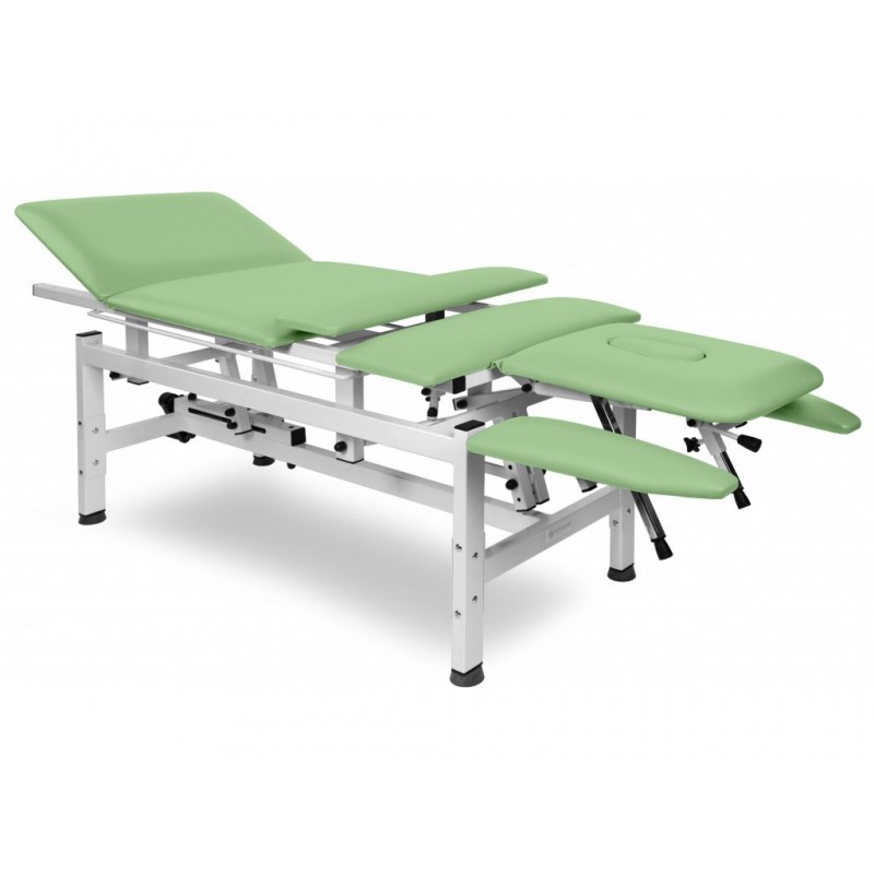 Podana cena nie zawiera widocznych podłokietników.JSR 4 to pięcioczęściowy modele stacjonarnego stołu rehabilitacyjnego. Posiada elektryczną regulację wysokości w zakresie do 12 cm przy środkowej części blatu, na wysokości odcinka lędźwiowego kręgosłupa. Podgłówek oraz podnóżek regulowane sprężyną gazową. W podgłówku znajduje się otwór z zatyczką. Posiada również uchwyty na pasy do stabilizacji po obu stronach leża, cztery regulowane stopki oraz podłokietniki. Stelaż w kolorze białym, a tapicerka skóropodobna w kolorze do wyboru.