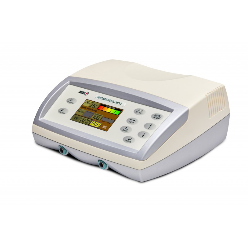Magnetronic MF-2 to przenośne urządzenie generujące pulsujące pole magnetyczne. Aparat jest dwukanałowy i pozwala na realizację zabiegu magnetoterapii jednocześnie na dwie okolice lub u dwóch różnych osób. Nowoczesny aparat MF-2 posiada ergonomiczną konstrukcję co pozwala na wykonywanie zabiegów zarówno w gabinecie jak i podczas wizyt domowych. Aparat może zostać wyposażony w trzy rodzaje aplikatorów (aplikator elastyczny, podwójny dysk na statywie oraz aplikator szpulowy). Torba transportowa przystosowana do magnetroniku MF-2 pozwala na wygodne zapakowanie i transport zarówno aparatu jak i aplikatorów. Zaletą aparatu jest także niska cena w stosunku do możliwość terapeutycznych nowoczesnego sprzętu jakim jest MF-2.
