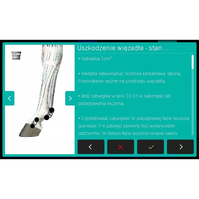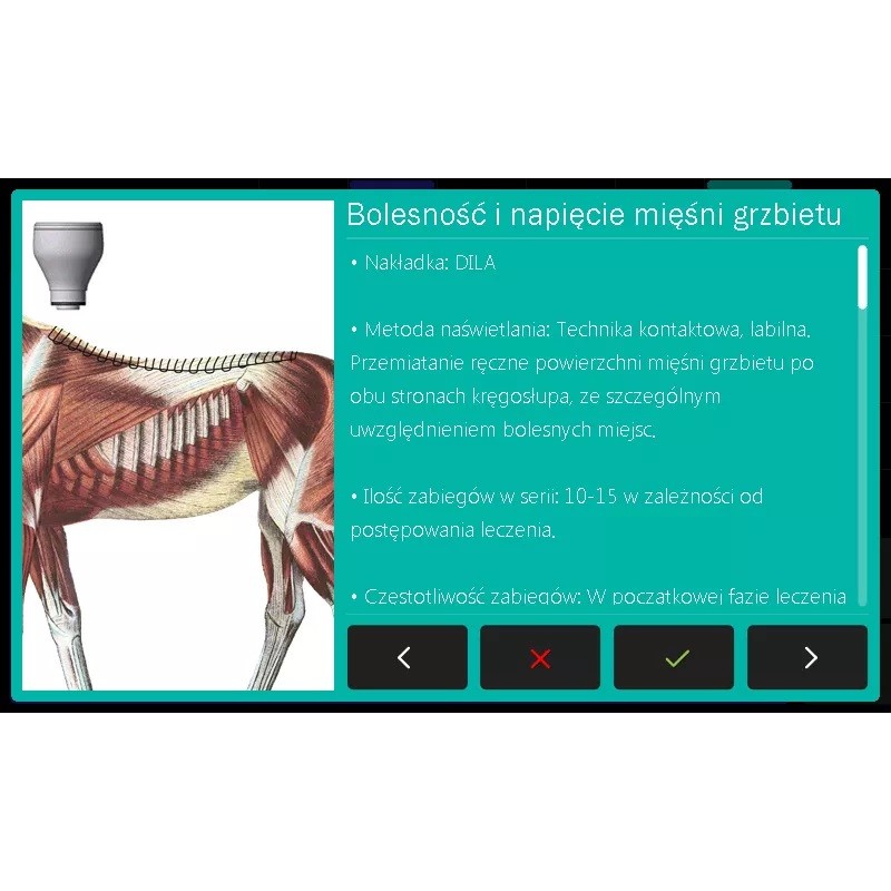 Laser wysokoenergetyczny dla zwierząt posiada wbudowane programy zabiegowe do terapii Koni do laseroterapii wysokoenergetycznej oraz biostymulacyjnej. Programy w tym aparacie, jak i inne przewodniki i wskazówki dotyczące fizjoterapii w weterynarii, zostały stworzone na podstawie długich badań prowadzonych dla nas przez doświadczonych zoofizjoterapeutów w Polsce