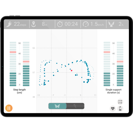 Baza danych pacjentów, przebyty dystans, liczba kroków, średnia prędkość, czas chodu, pozycja środka nacisku na podłoże, cykl chodu, obciążenie kończyny w trakcie cyklu chodu, długość kroku |