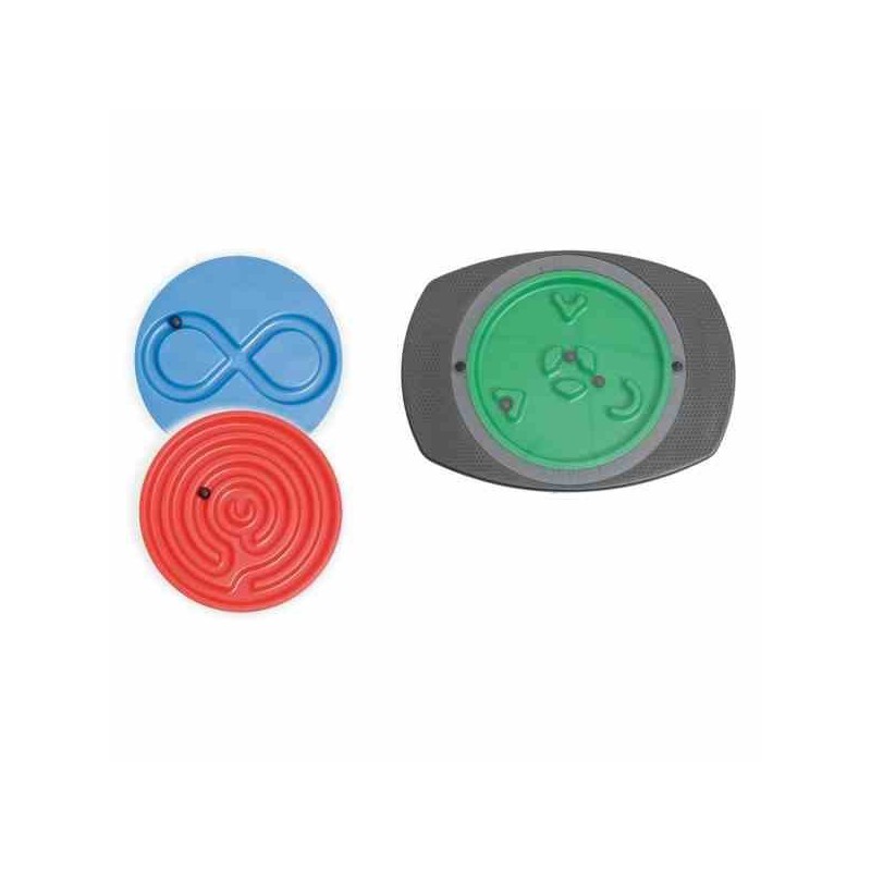 Labirynt (Zyk-zak): Podstawa z trzema wymiennymi wkładkami - fioletowa: poziomy labirynt, pomarańczowa: labirynt w kole i żółta z myszką przesuwającą się na kuleczce.