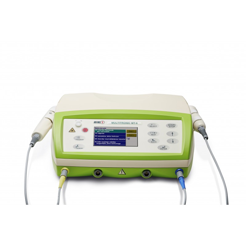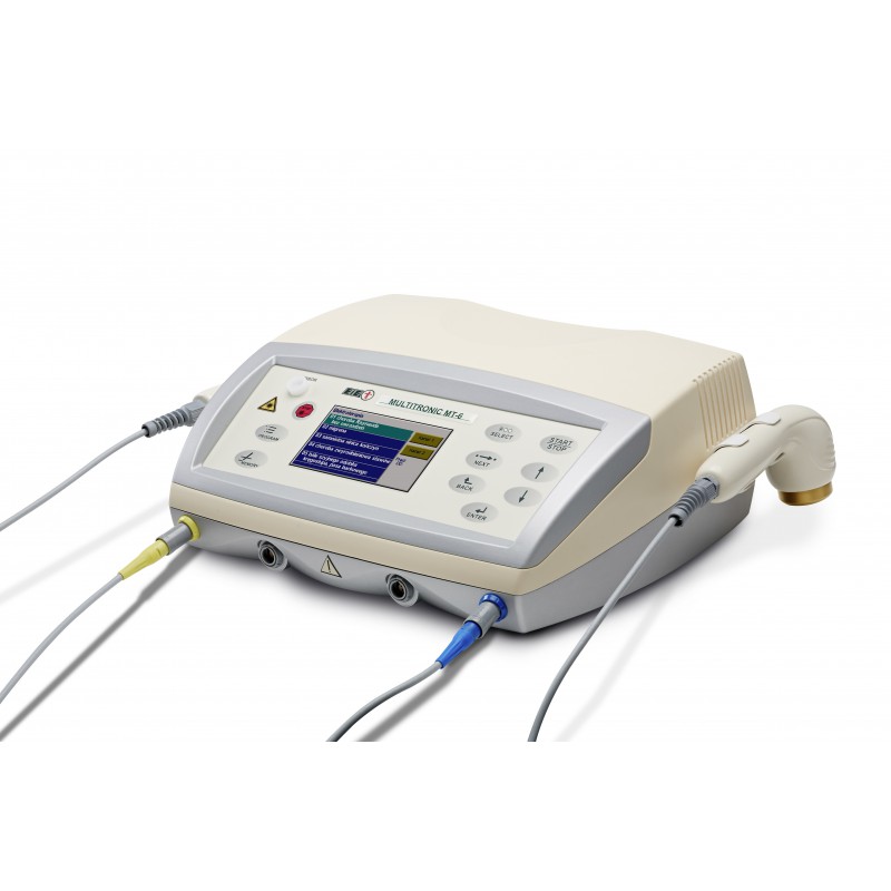 Multitronic MT-6 to uniwersalny aparat do dwukanałowej elektroterapii, laseroterapii oraz sonoterapii, umożliwiający wykonanie 3 terapii. Multitronic MT-6 pozwala na wykonanie trzech zabiegów z użyciem głowicy ultradźwiękowej, sondy laserowej oraz elektrod do zabiegów elektroterapii. Nowoczesna forma urządzenia umożliwia wykonanie dwóch zabiegów jednocześnie lub jednoczasową realizację zlecenia fizykoterapeutycznego u dwóch pacjentów. Pozwala także na wykonanie terapii skojarzonej.