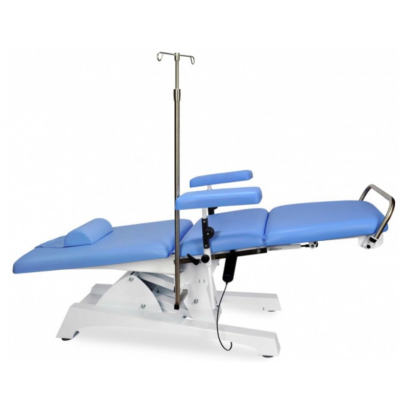 Oparcie, siedzisko i podnóżek regulowane za pomocą sprężyn gazowych. Możliwość uzyskania pozycji Trendelenburga i anty-Trendelenburga. Wysokość regulowana za pomocą pilota ręcznego. Podłokietniki również regulowane. Tapicerka skóropodobna, bezszwowa, kolor do wyboru.