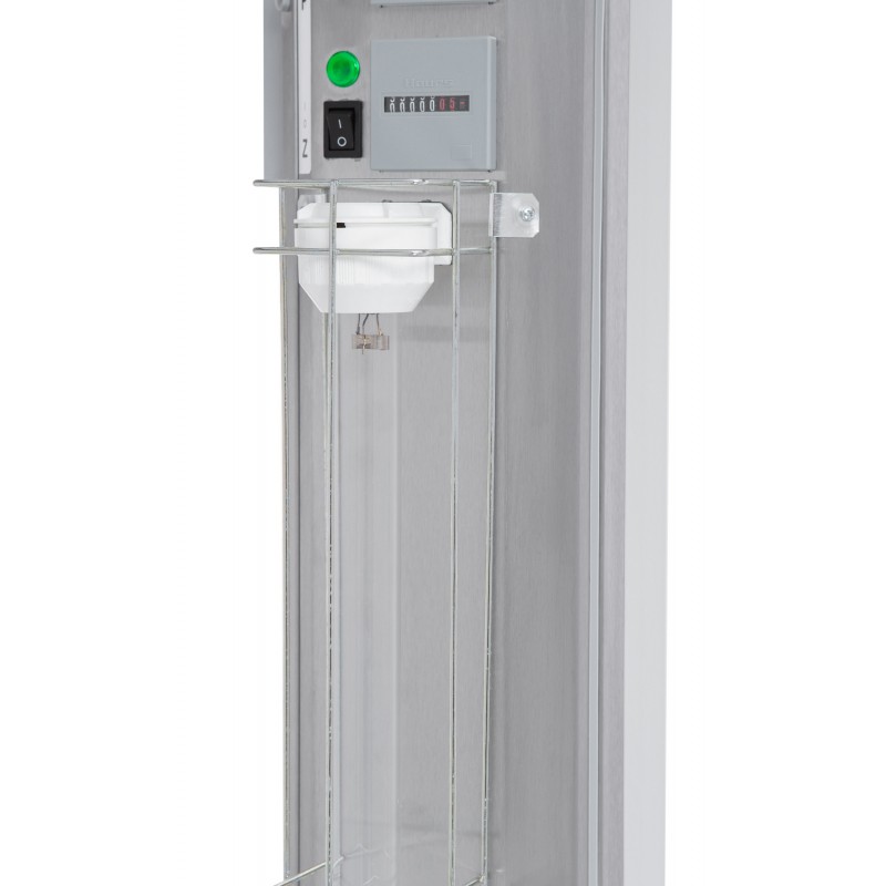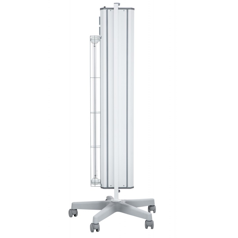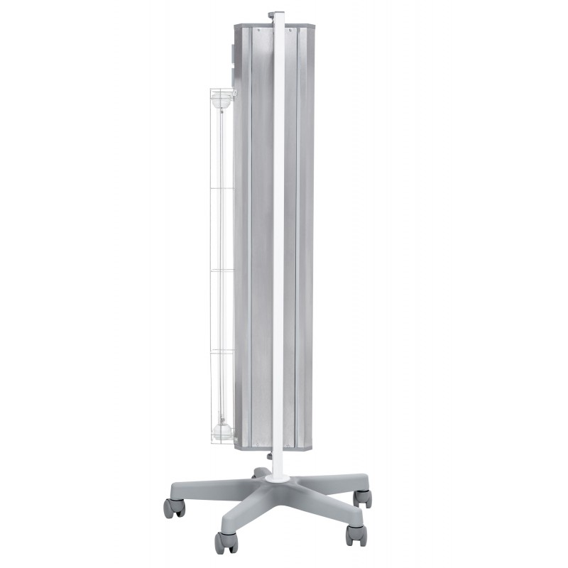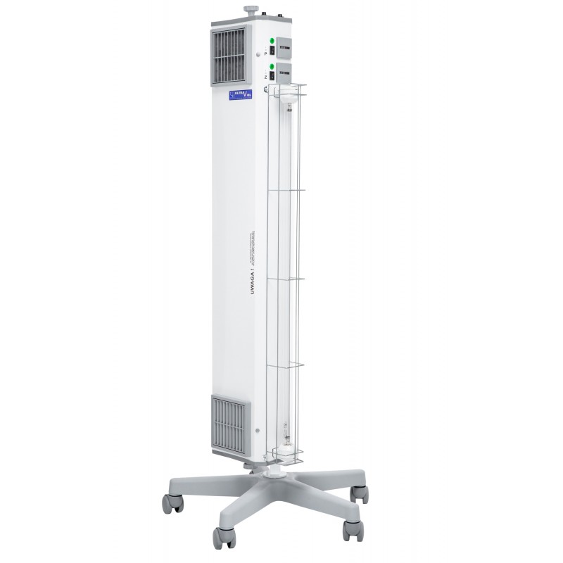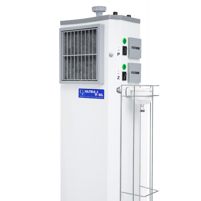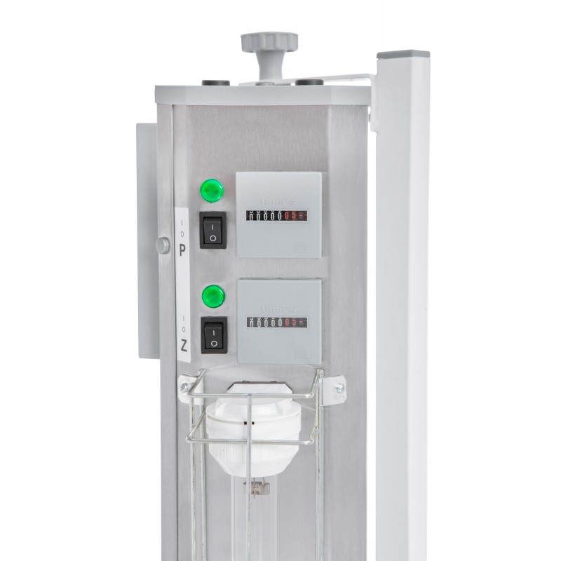 Przepływowa, dwufunkcyjna lampa jest wyposażona w 2 rodzaje promienników. Dzięki promiennikowi wewnętrznemu można korzystać ze sprzętu w obecności personelu i pacjentów. Szkodliwe promieniowanie o długości 253nm pomaga zatrzymywać obudowa wykonana z kwasoodpornej blachy. Urządzenie ma też wbudowany wentylator, który odpowiada za cyrkulację powietrza wewnątrz urządzenia. Dzięki temu szkodliwe drobnoustroje są likwidowane nawet w czasie wizyty pacjenta.