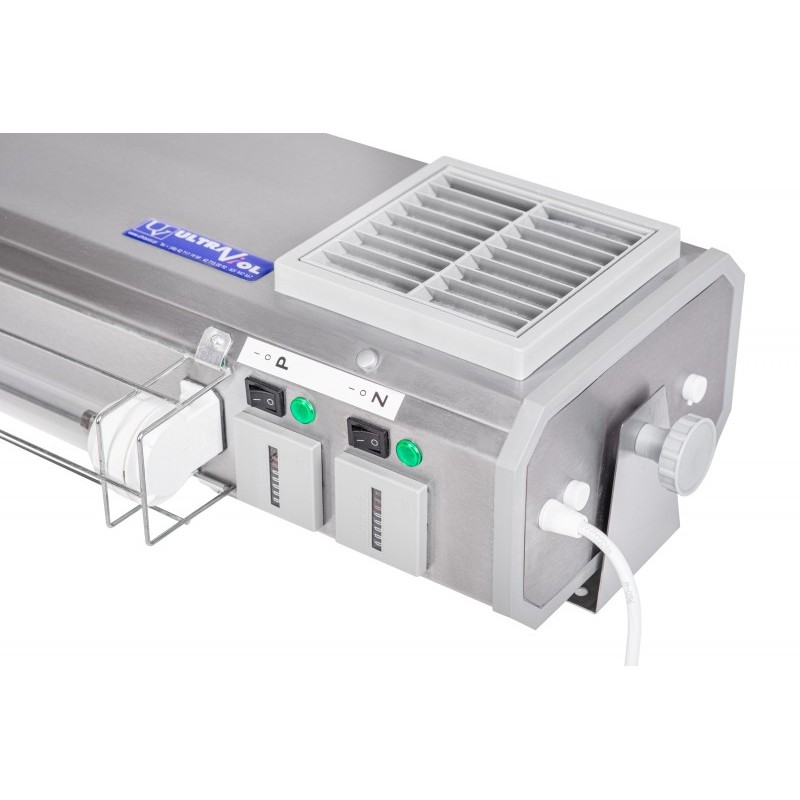 Dwufunkcyjna lampa jest wyposażona w 2 rodzaje promienników. Dzięki promiennikowi wewnętrznemu można korzystać ze sprzętu w obecności personelu i pacjentów. Szkodliwe promieniowanie o długości 253nm pomaga zatrzymywać obudowa wykonana z kwasoodpornej blachy. Urządzenie ma też wbudowany wentylator, który odpowiada za cyrkulację powietrza wewnątrz urządzenia. Dzięki temu szkodliwe drobnoustroje są likwidowane nawet w czasie wizyty pacjenta. Do uruchomienia zewnętrznego promiennika należy opuścić pomieszczenie. Pomoże on odkazić nie tylko powietrze, ale także powierzchnie. Lampa posiada wbudowany licznik czasu, co pozwala automatyczne włączanie i wyłączanie.