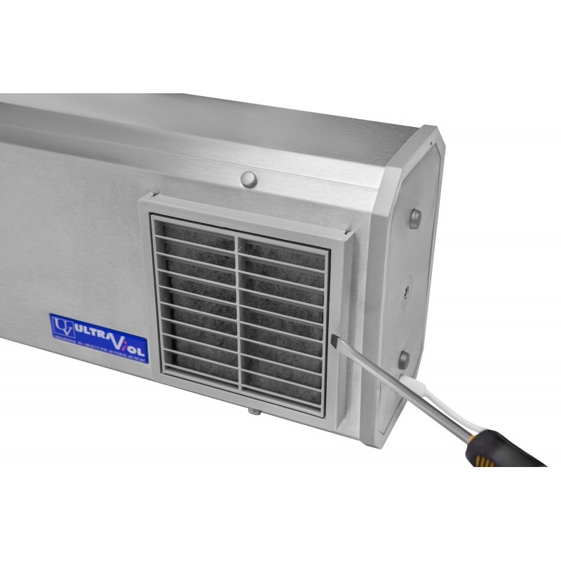 - wymuszony przepływ powietrza przez komorę UV-C sprawia, że szkodliwe promieniowanie emitowane przez promienniki wewnętrzne nie wydostaje się na zewnątrz