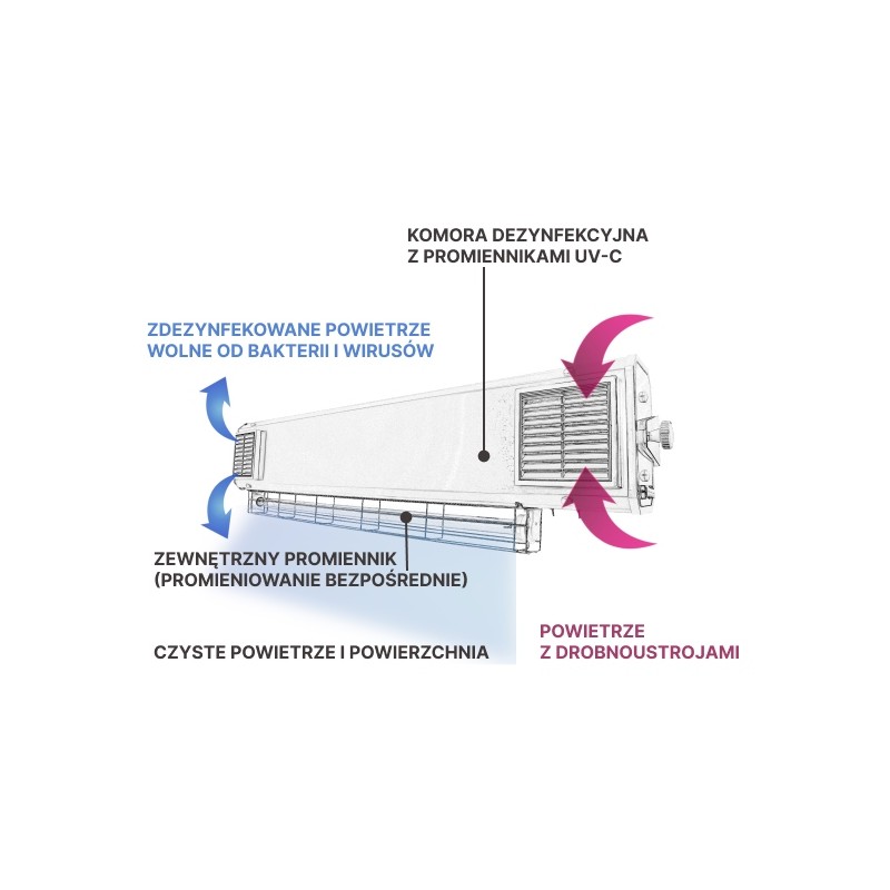 - wymuszony przepływ powietrza przez komorę UV-C sprawia, że szkodliwe promieniowanie emitowane przez promienniki wewnętrzne nie wydostaje się na zewnątrz