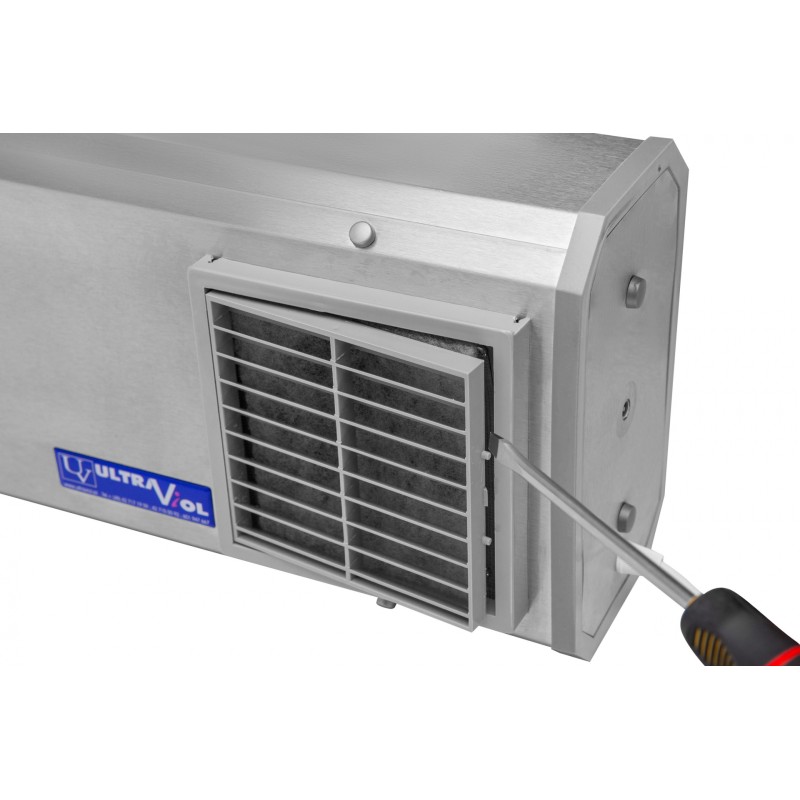 - wymuszony przepływ powietrza przez komorę UV-C sprawia, że szkodliwe promieniowanie emitowane przez promienniki wewnętrzne nie wydostaje się na zewnątrz