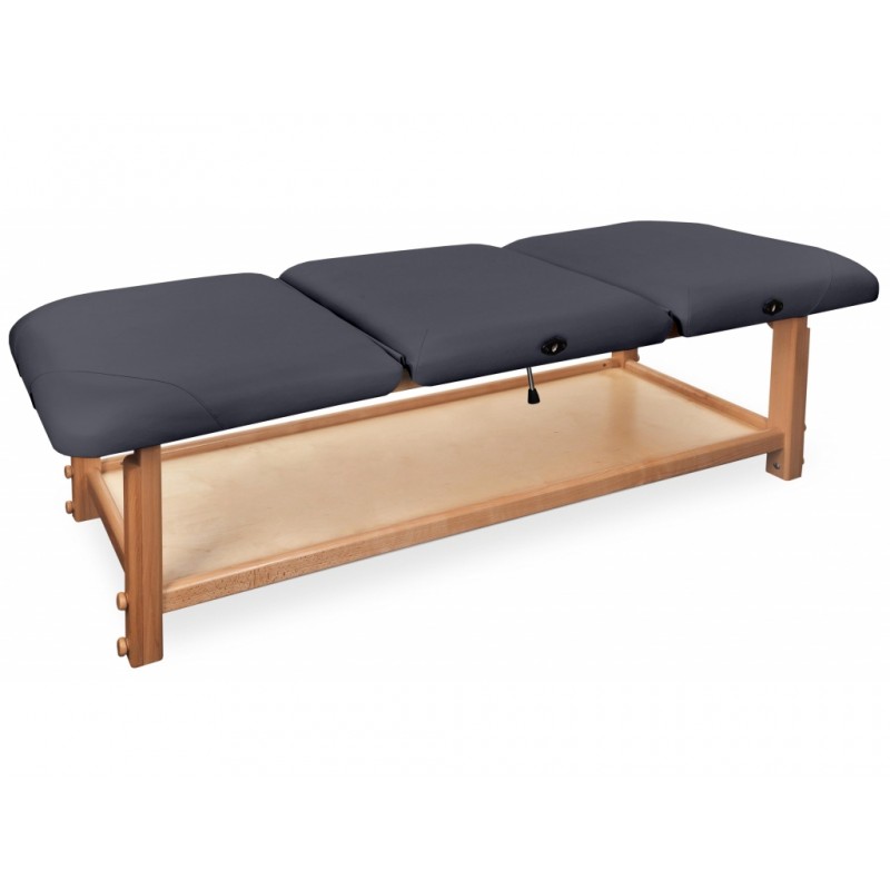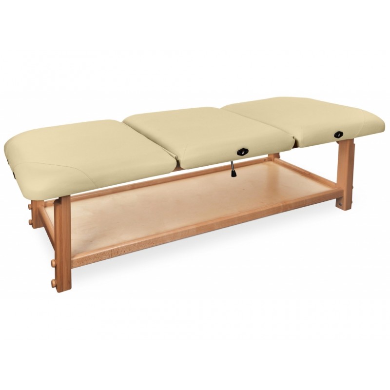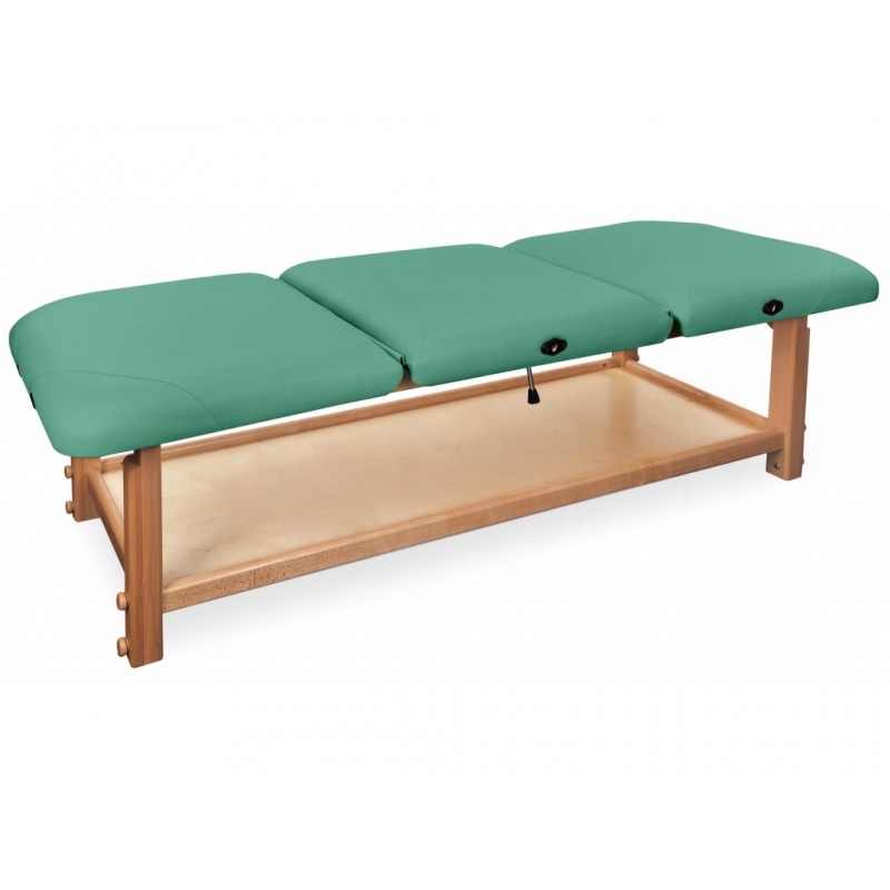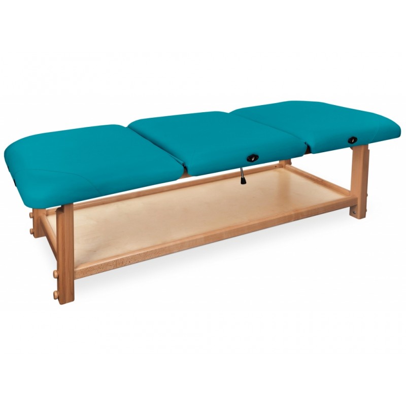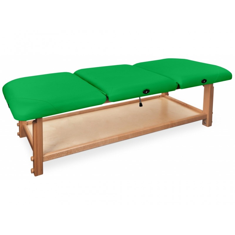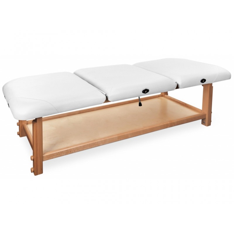 GAIA III to najbardziej rozbudowana kozetka pochodząca z serii GAIA. Składa się z drewnianego blatu oraz wygodnego materaca, wykonanego z doskonałej jakości materiału skóropodobnego lub winylowego. Posiada funkcjonalną półkę pod leżyskiem, która może służyć do przechowywania materiałów potrzebnych do wykonywania masażu lub fizykoterapii.