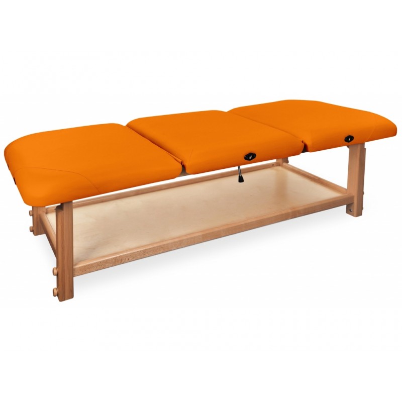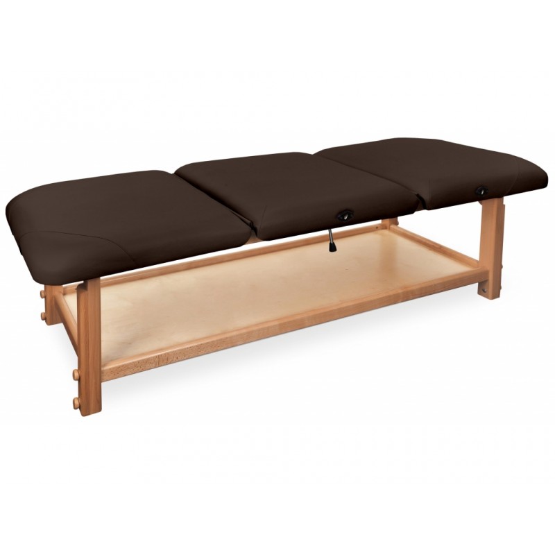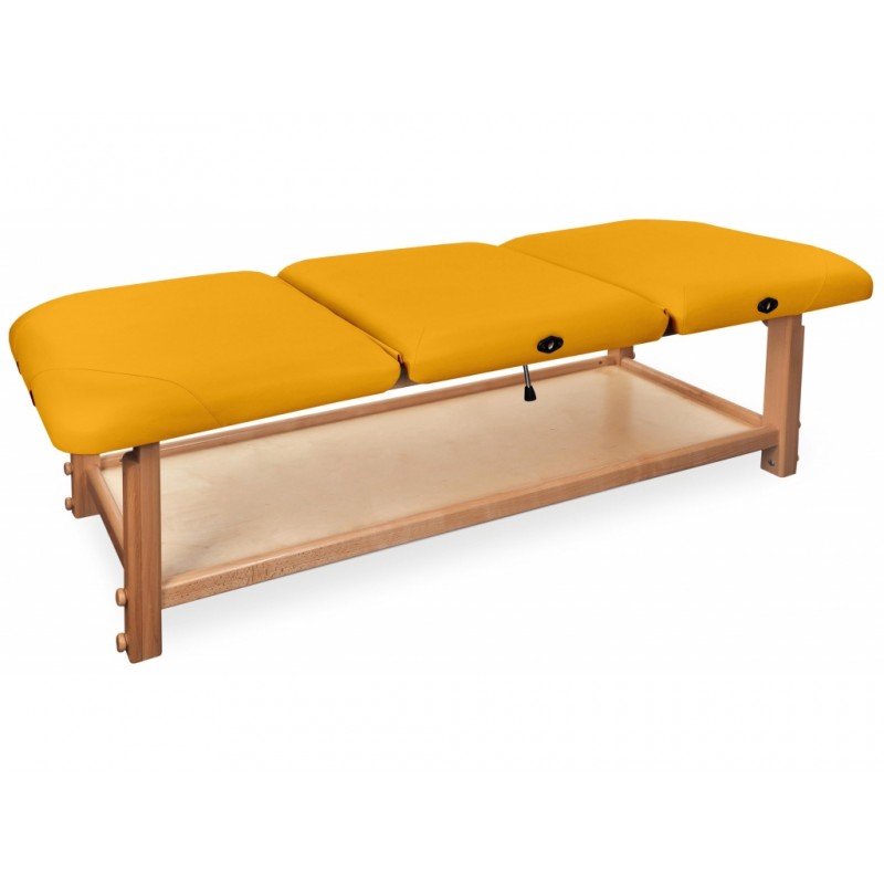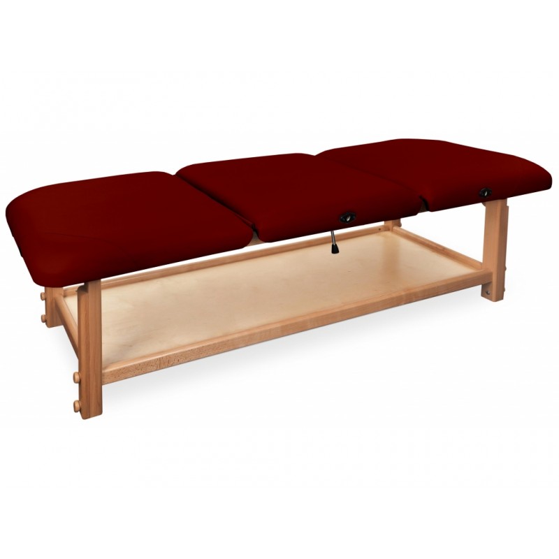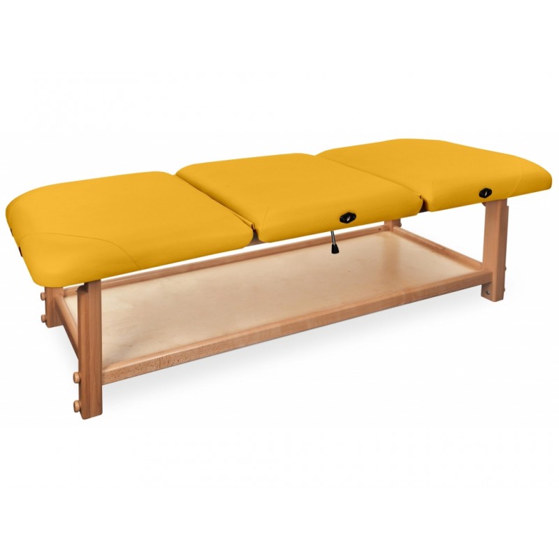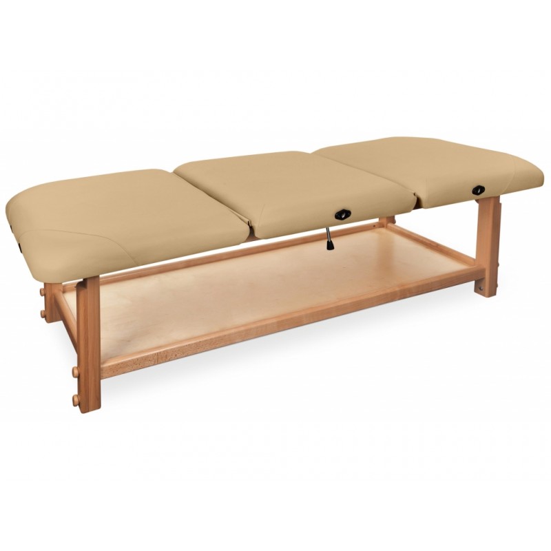GAIA III to najbardziej rozbudowana kozetka pochodząca z serii GAIA. Składa się z drewnianego blatu oraz wygodnego materaca, wykonanego z doskonałej jakości materiału skóropodobnego lub winylowego. Posiada funkcjonalną półkę pod leżyskiem, która może służyć do przechowywania materiałów potrzebnych do wykonywania masażu lub fizykoterapii.