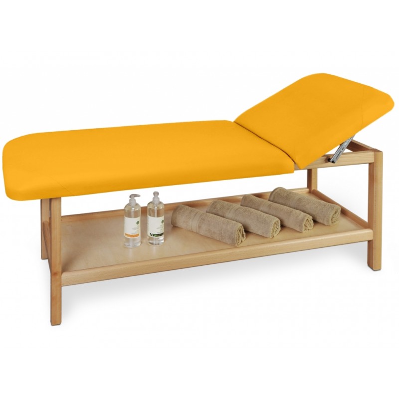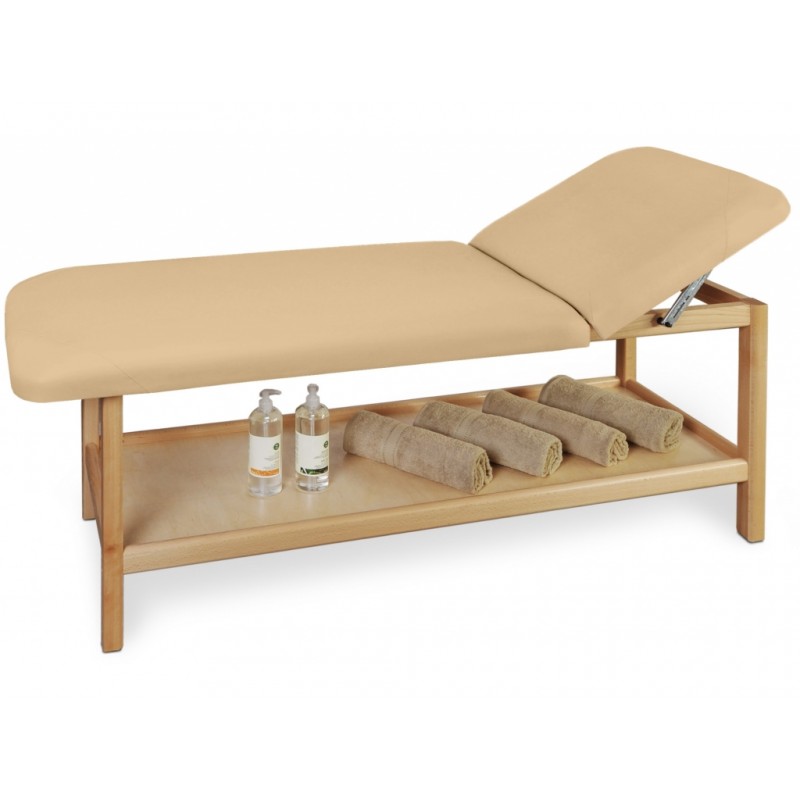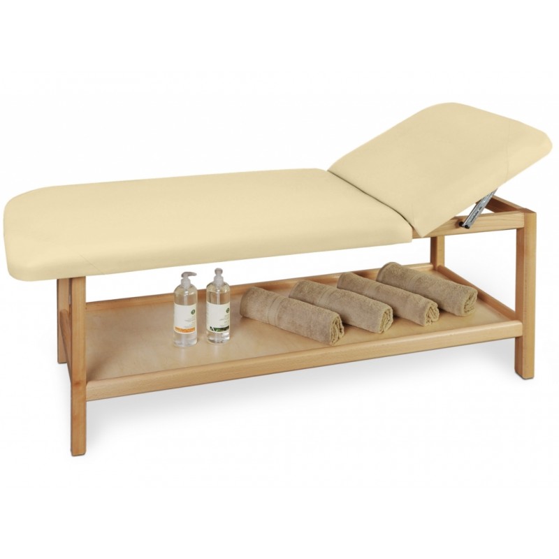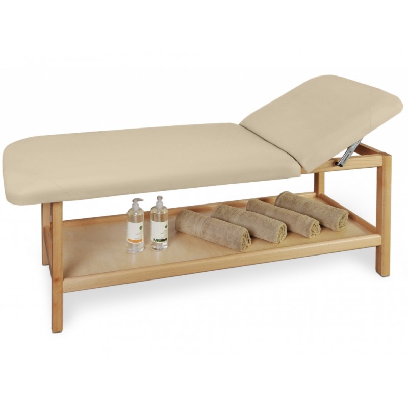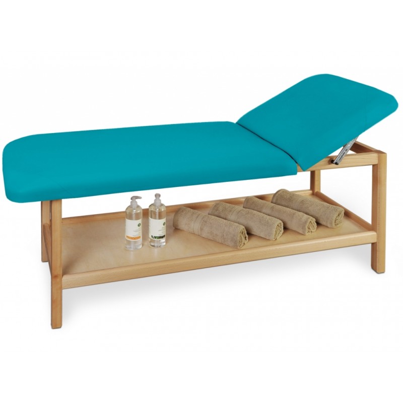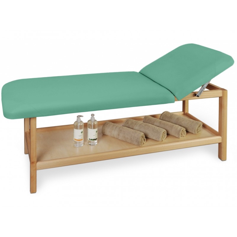 Leżanka HERA posiada stabilną, drewnianą konstrukcję i materac wykonany z wysokiej jakości materiału skóropodobnego lub winylowego. Dzięki swojemu eleganckiemu wyglądowi, nadaje niepowtarzalny wystrój i ciepło placówkom medycznym i gabinetom kosmetycznym. Dodatkowo do przechowywania materiałów potrzebnych przy wykonywaniu fizykoterapii czy też masaży służy zamocowana pod leżyskiem półka. Leżankę możemy regulować tak, by pacjent znalazł się w pozycji dostosowanej do wykonywanego zabiegu - leżącej, półeżącej lub siedzącej.