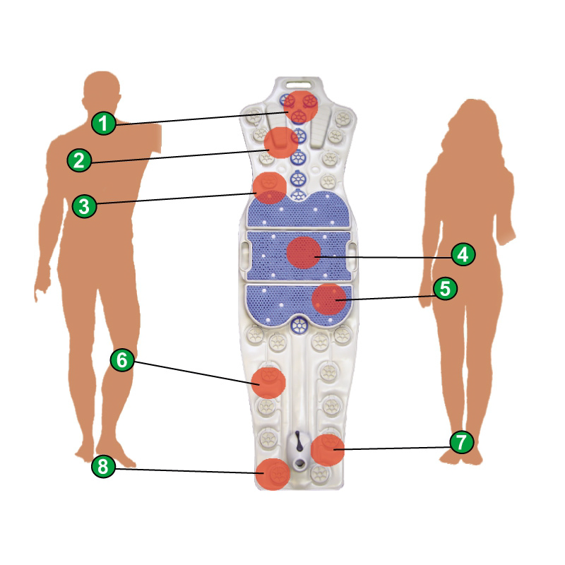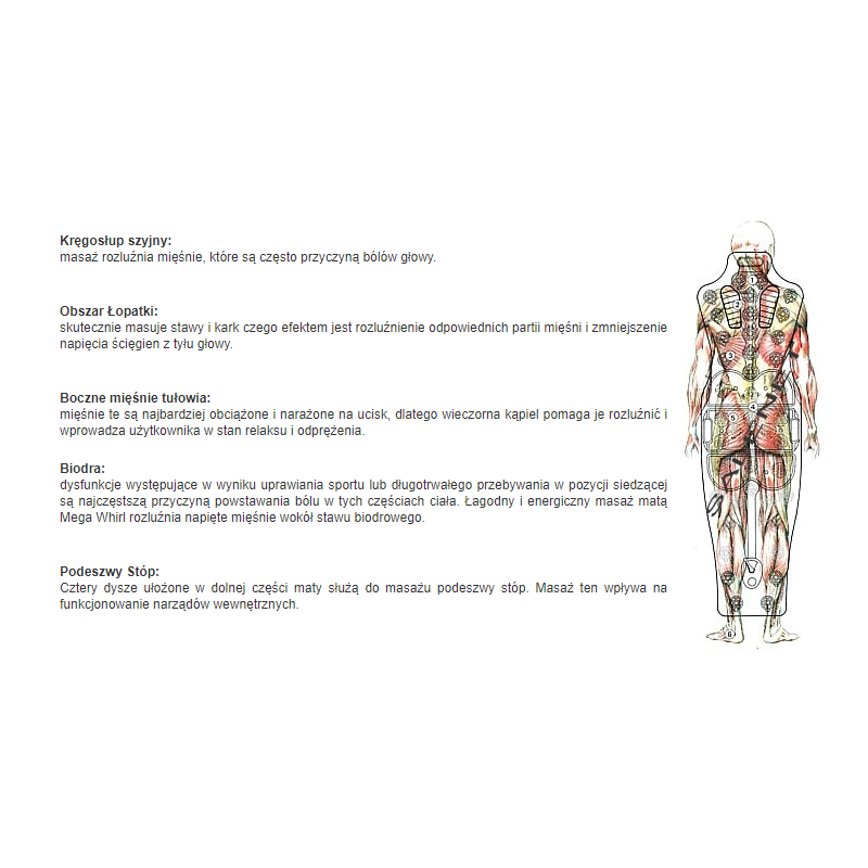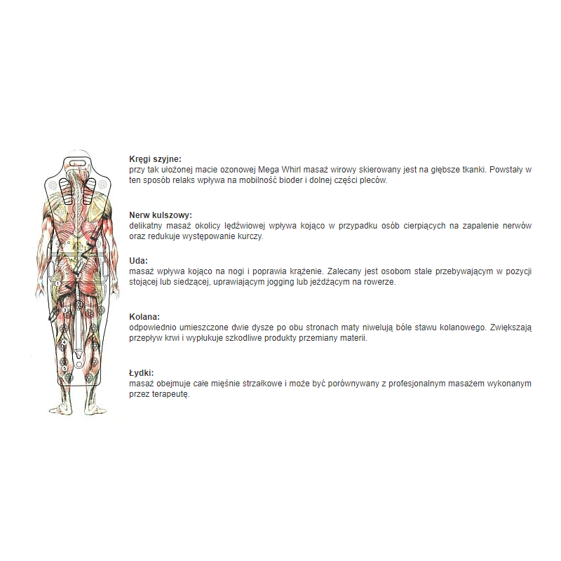 Możliwość sterowania strumieniem perełek (kark, barki, lędźwi,dolne kończyny,kręgosłup). Zapobiega to podrażnieniom centralnego układu nerwowego oraz przeciwdziała mięśniowym naprężeniom, zaś wewnętrznie uzyskana harmonia gwarantuje znakomite odprężenie - oraz efekt detoksykacji i regeneracji naskórka (algi). Kąpiel perełkowa ozonowa znakomicie neutralizuje bóle kręgosłupa oraz dolegliwości narządu ruchu. Mata MegaWhirl posiada duże regulowane oraz wymienne dysze masujące na wysokości szyjnego, piersiowego i lędźwiowego odcinka kręgosłupa oraz w okolicy nerwu kulszowego. Dysze to oddziałują doskonale na punkty receptorów odpowiedzialne za napięcia mięśniowe, zastrzały ,skurcze oraz dolegliwości bólowe. Mata ozonowa MegaWhirl umożliwia stosowanie zabiegów hydromasażu wzdłuż kręgosłupa, mięśni przykręgosłupowych, ramion, barków, karku oraz kończyn dolnych i górnych Atutem jest trójdzielne siedzisko wykonane z materiału antybakteryjnego pozwalające na dopasowanie maty do indywidualnych wymogów użytkowników.
