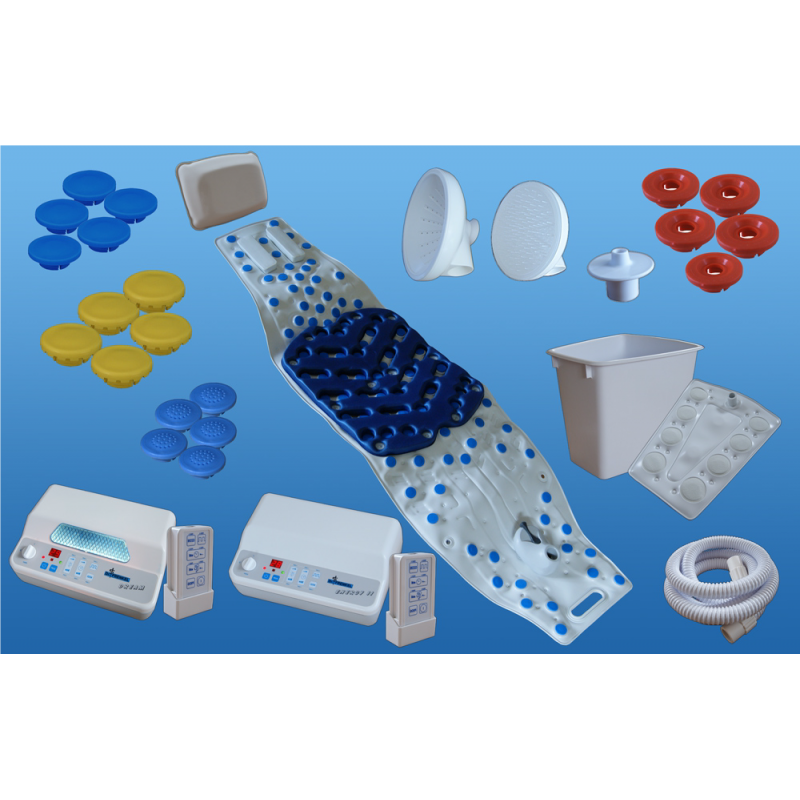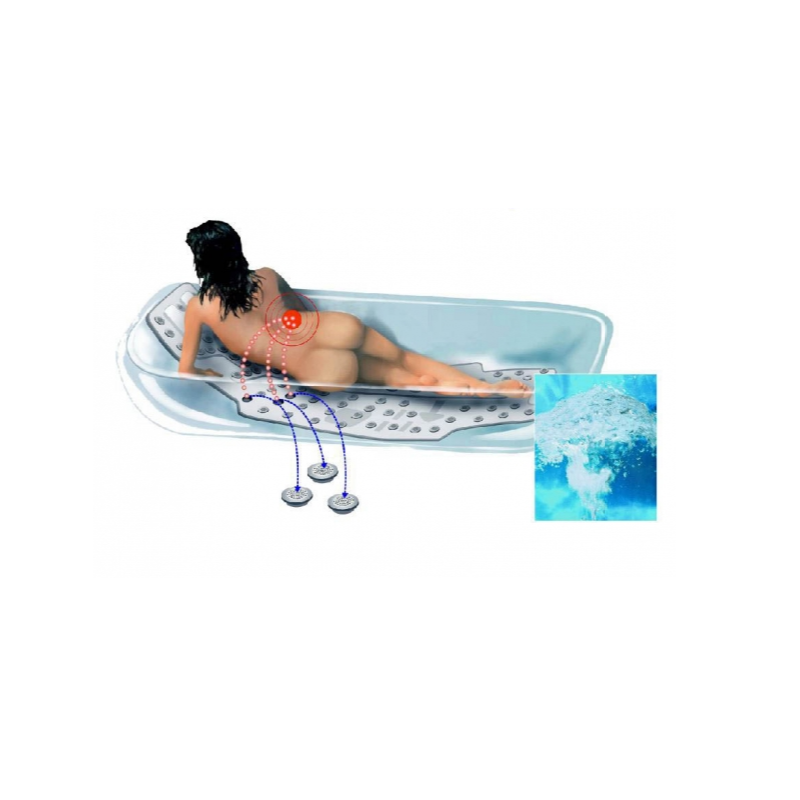 Mata ozonowa VarioWhirl najnowszej generacji wykonana z miękkiego, bardzo elastycznego, hipoalergicznego tworzywa. Idealnie dopasowuje się zarówno do każdego kształtu wanny, jak i poszczególnych partii ciała. Bardzo wygodna, bo działająca na zasadzie poduszki powietrznej mata o długości 140 cm i szerokości 40 cm. Dzięki swojej budowie pozwala m.in. na masaż karku i tyłu głowy. Uruchamiany na żądanie intensywny masaż stóp, stawów i okolic pośladków. Możliwość sterowania strumieniem perełek na strefę kręgosłupa (kręgosłup, ramiona, kark) lub całą wkładkę. 100 wymiennych dysz, których rozmieszczenie na powierzchni maty dostosowane zostało do budowy anatomicznej człowieka. Użytkownik może wybierać pomiędzy małymi i dużymi perełkami a także masażami wirowymi lub strumieniowymi. Może także tworzyć bardzo ostre, silne masaże- gejzery wodne. Poduszki unoszące ciało w strefie lędźwiowej kręgosłupa w celu maksymalizacji efektu masażu. Atutem jest wymienne siedzisko wykonane z bakteriobójczego materiału oraz wysoki komfort działania opartego na patencie poduszki powietrznej Dr.Frenkla. Inteligentny zawór pozwala na rozmieszczenie masażu w różnych strefach maty lub dostosowaniu ich do indywidualnych potrzeb użytkownika.