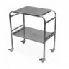Stolik zabiegowy STZ 02 stosowany jest do przewozu narzędzi, materiałów opatrunkowych oraz leków w szpitalach, laboratoriach oraz w gabinetach zabiegowych. Osadzony jest na kółkach jezdnych. Wersja biała posiada malowane proszkowo półki, natomiast stolik chromowany ma półki wykonane ze stali nierdzewnej.