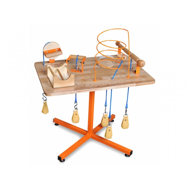 Tablica do ćwiczeń manualnych dłoni z oporem wyposażona jest w przyrządy do ćwiczeń dłoni oraz nadgarstka. Przeznaczona jest dla dzieci i dla dorosłych. Tablica umocowana jest na obrotowym blacie o wymiarach długość 72 cm x szerokość 52 cm. Wysokość tablicy regulowana jest od 55cm do 88 cm. Na każdym z przyrządów umocowane są obciążniki o wadze 22 dkg.