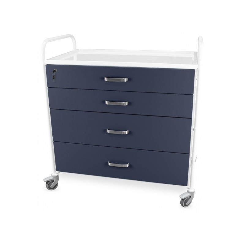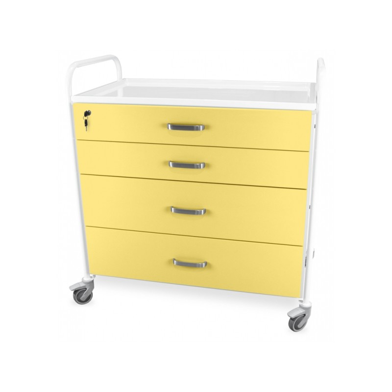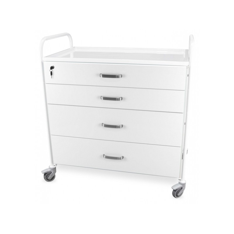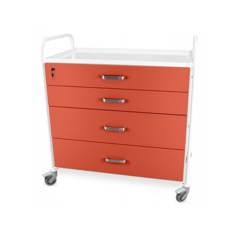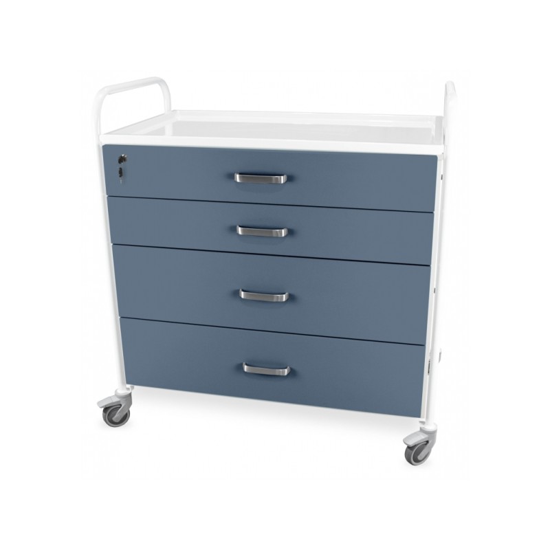 Taca wózka wykonane są ze stali pokrytej farbą proszkową odporną na zarysowania. Korpus wózka wykonany jest z płyty wiórowej zaś fronty z płyty MDF. Całość pokryta jest okleiną PCV. Wózek osadzony jest na stalowej podstawie wyposażanej w kółka jezdne z hamulcem. Szuflady wózka wyłożone są matą antypoślizgową. W standardzie górne szuflady wyposażone są w zamek. System szynowy znajdujący się po obu stronach wózka umożliwia zamontowanie dodatkowego wyposażenia na jednej z czterech szyn.